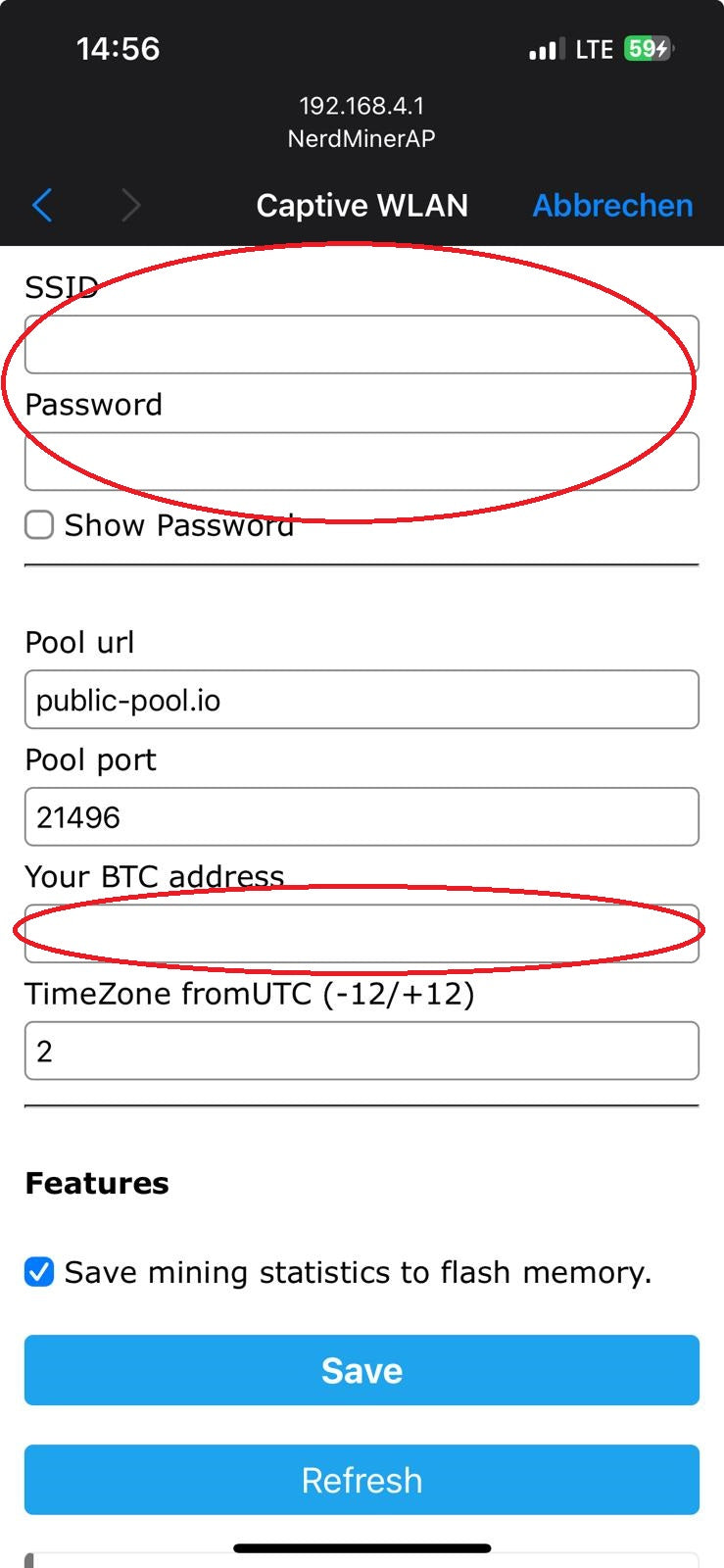 Type in your wifi + password and bitcoinadress